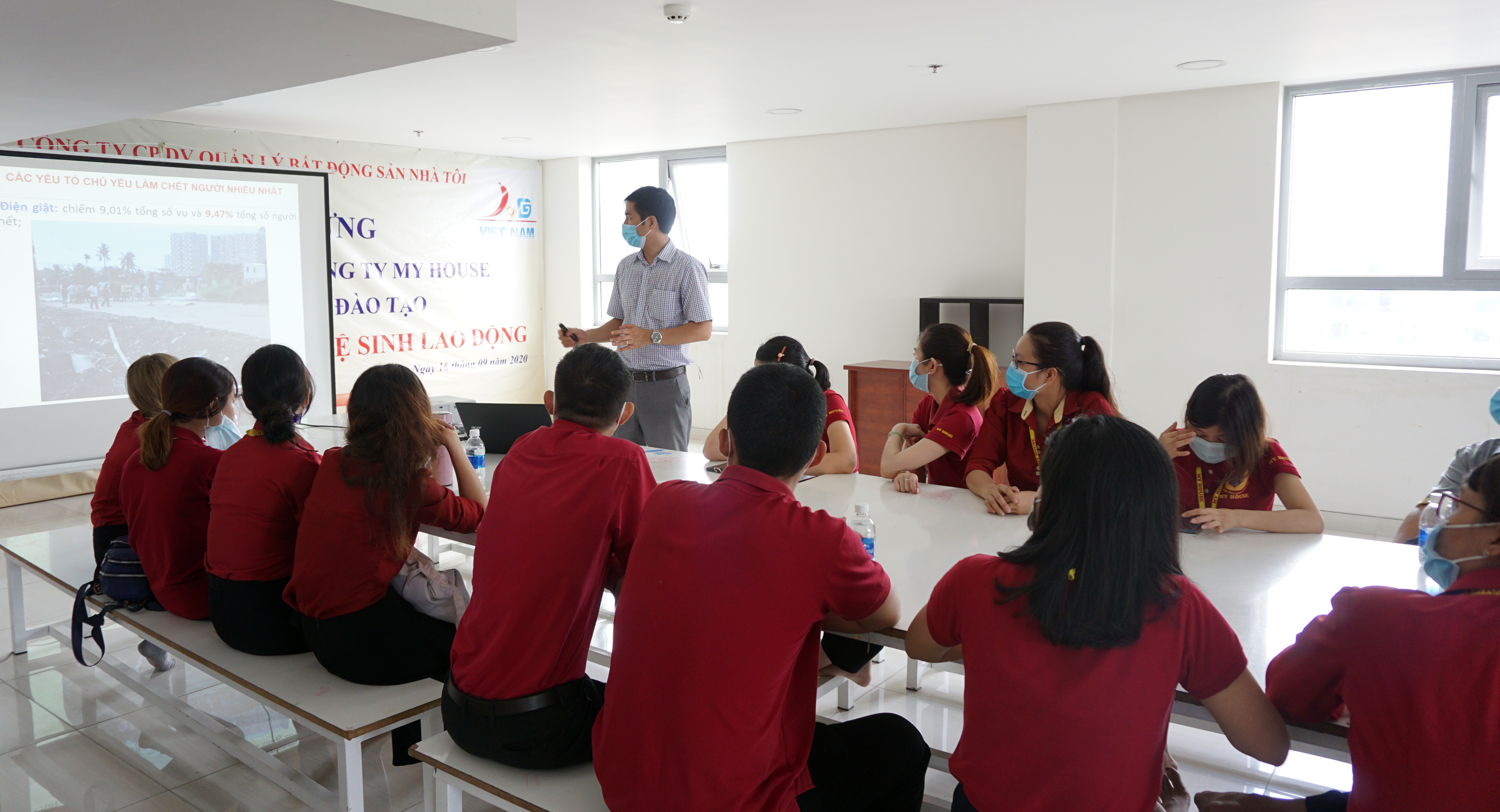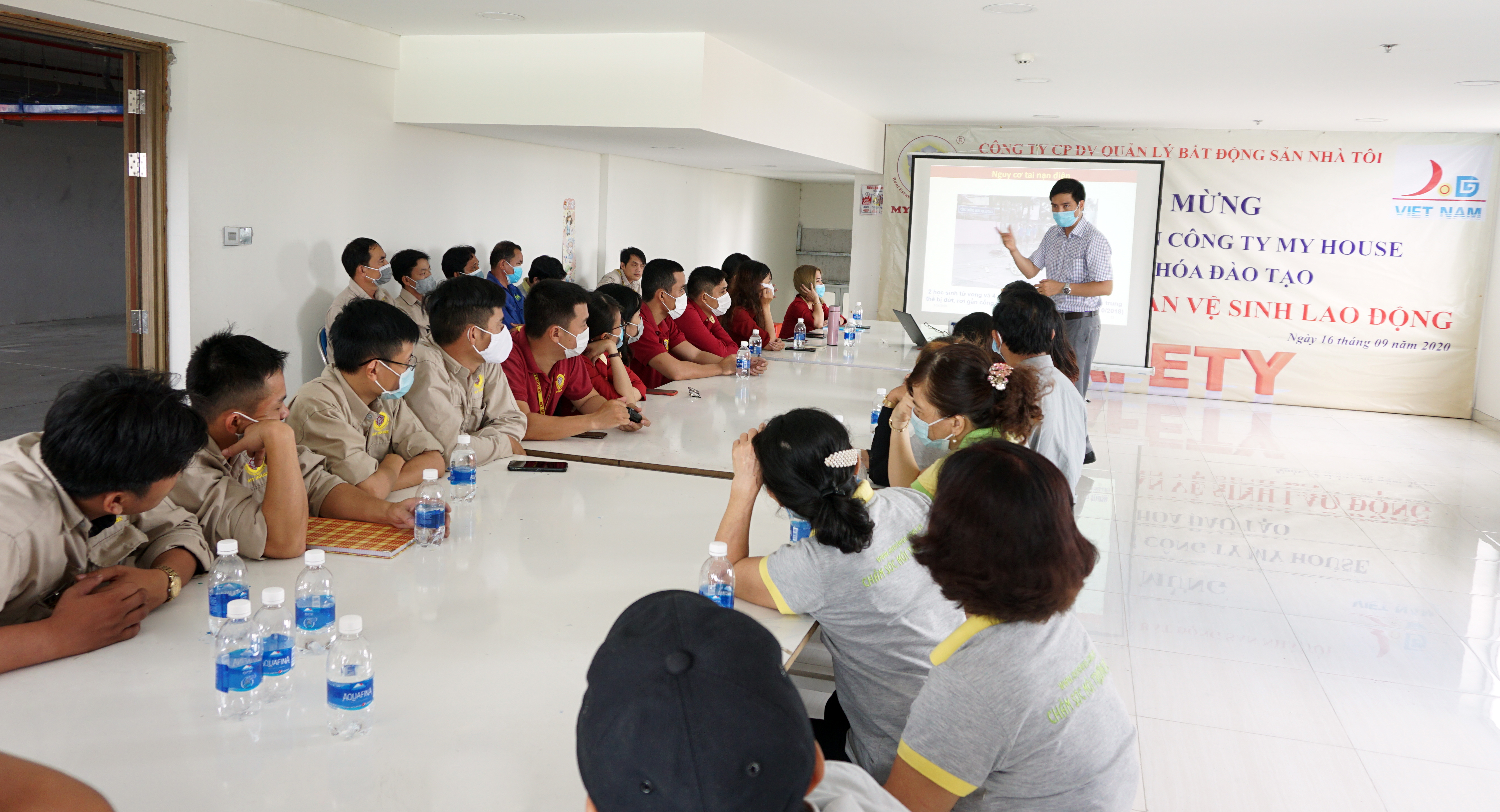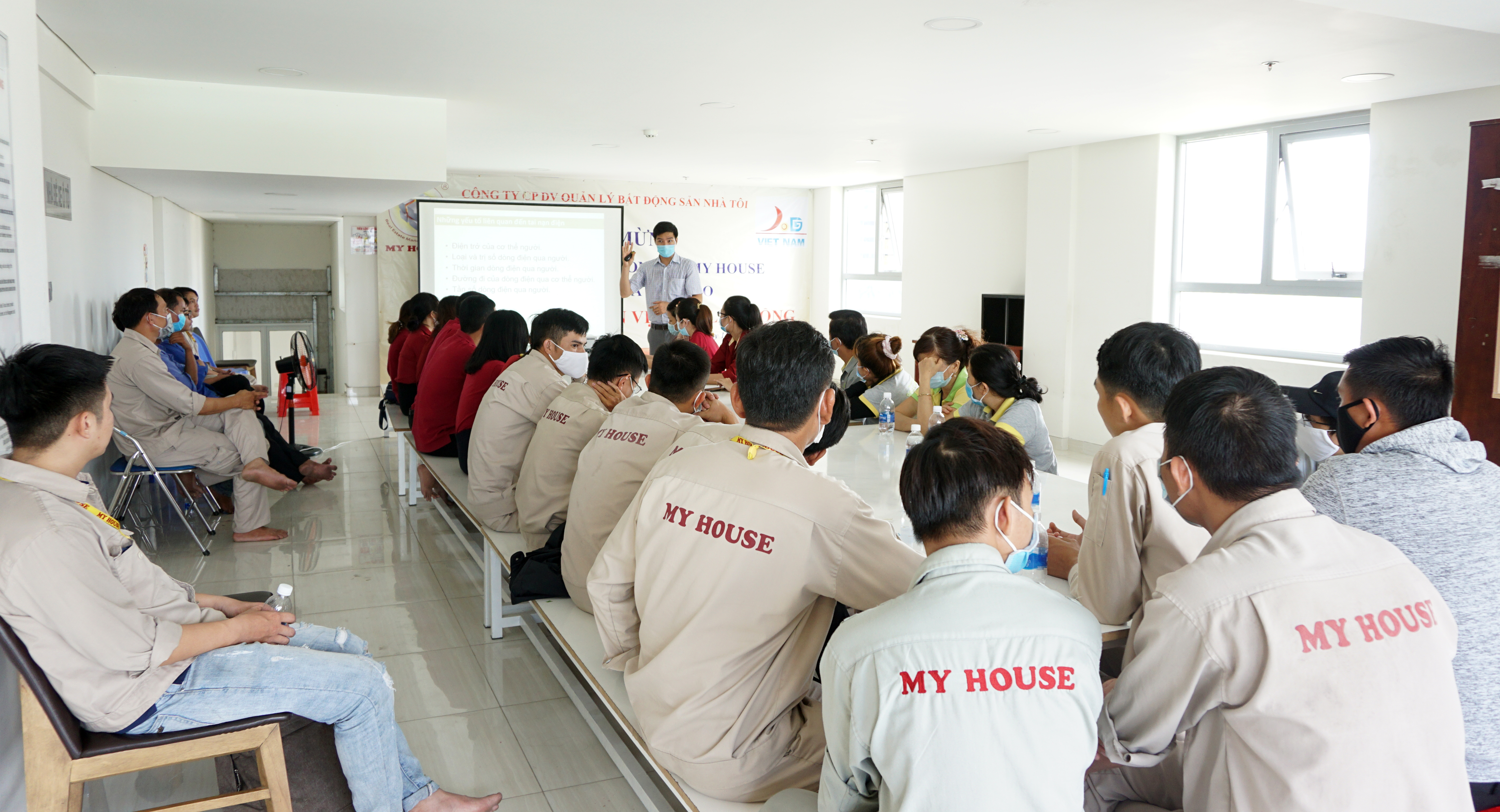 Từ việc hiểu được tầm quan trọng của việc trang bị các kiến thức về An toàn lao động và Vệ sinh lao động, để người lao động chủ động nhận biết được các mối nguy hiểm tiềm ẩn trong quá trình làm việc cũng như đưa ra biện pháp phòng tránh sự cố tai nạn nghề nghiệp, giúp cho bản thân người lao động có thể làm việc được hiệu quả và chuyên nghiệp hơn. Ngày 16/09/2020 vừa qua My House đã tổ chức khóa tập huấn An toàn lao động và Vệ sinh lao động cho nhân viên các bộ phận của công ty và nhân viên nhà thầu phụ Vệ sinh cùng tham gia.