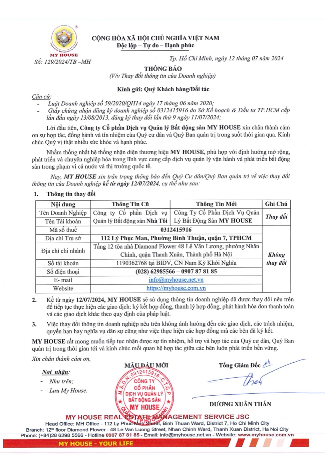 Nhằm thống nhất hệ thống nhận diện thương hiệu MY HOUSE, phù hợp với định hướng mở rộng, phát triển và chuyên nghiệp hóa trong lĩnh vực cung cấp dịch vụ quản lý vận hành và phát triển bất động sản trong phạm vi cả nước và thị trường quốc tế, nay MY HOUSE xin trân trọng thông báo đến toàn thể Qúy Khách hàng/ Đối tác và toàn thể Nhân sự về việc đổi tên doanh nghiệp kể từ ngày 12/07/2024, cụ thể như sau: