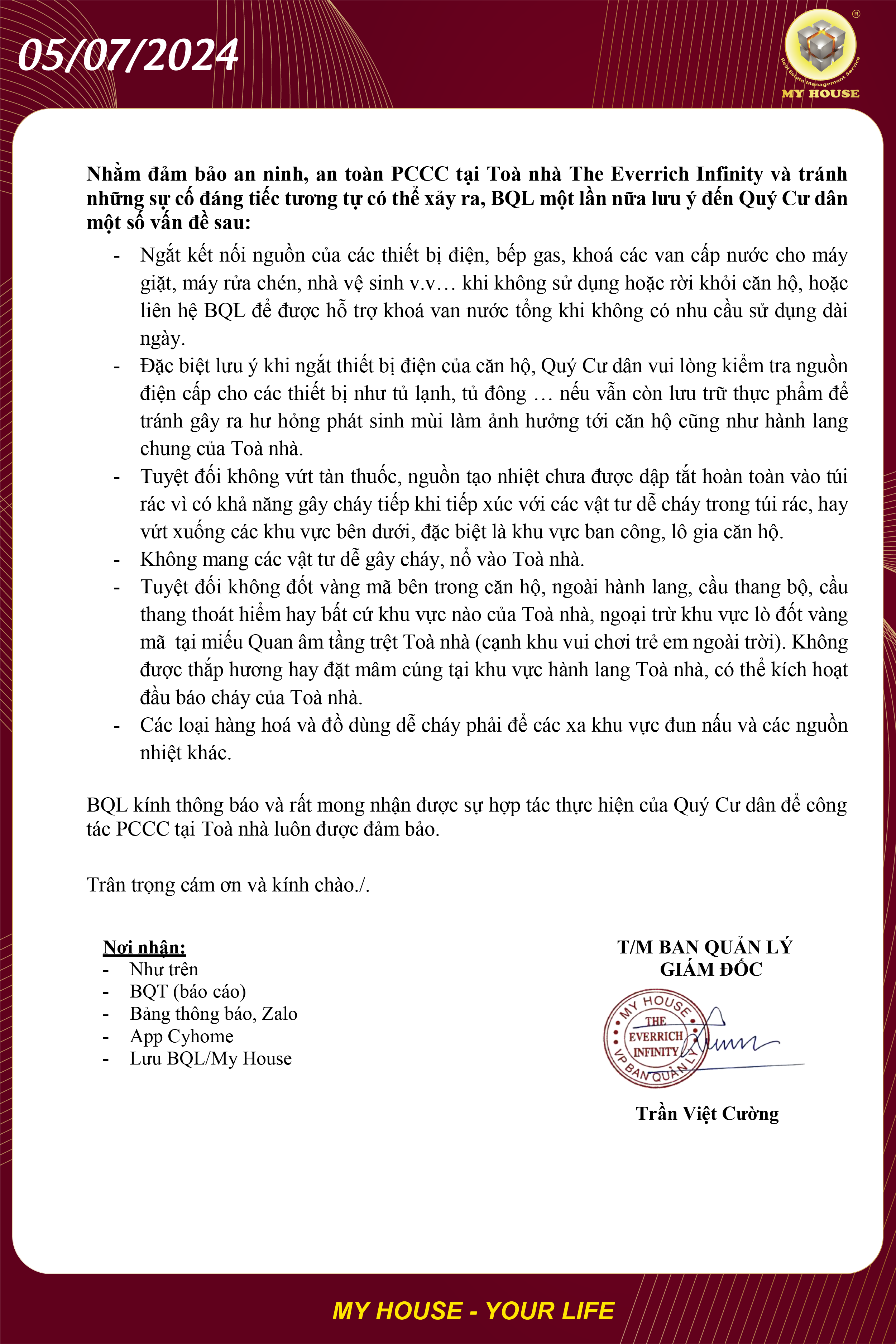Qua sự việc trên, chúng ta cũng thấy rõ sự nguy hiểm của việc sử dụng điện trong sinh hoạt hàng ngày. Một lần nữa, My House khuyến cáo quý cư dân rà soát lại các thiết bị sử dụng điện trong hộ gia đình, các đường dây dẫn, ổ cắm và công suất sử dụng điện phù hợp, tắt các thiết bị sử dụng điện khi rời khỏi nhà. Chỉ cần bất cẩn một chút thôi, có thể chúng ta đã gây ra thảm hoạ cho tính mạng và tài sản của bản thân và người xung quanh.